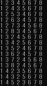 {1, 2, 3, 5, 4, 8, 7, 6} 의 집합에서 3개를 선택하여 나열하는 코드이다.