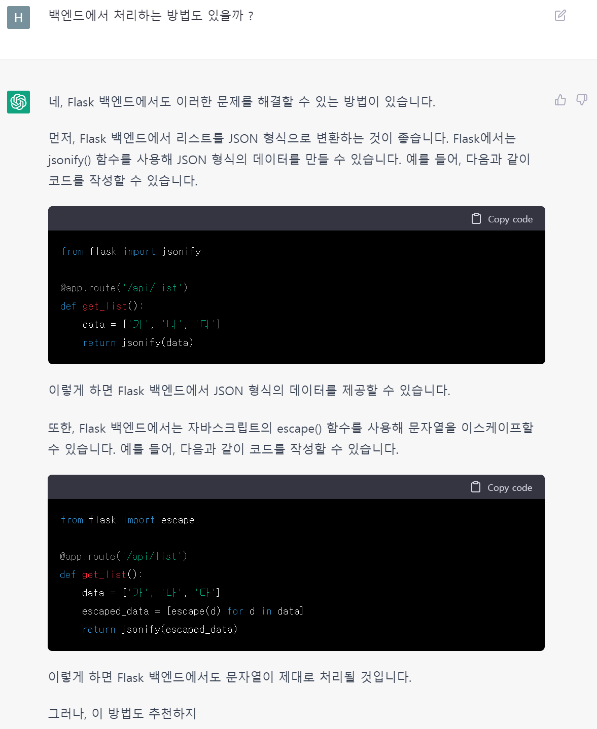 먼저 내 상황을 그대로 물어보았다. str.replace(/'/g, "\'"); 를 사용하여 해결할 수 있지만 복잡하고 번거로운 방법이라 추천하지 않는다고 한다. 아직 답변이 조금 부족하다고 생각해서 다시 질문해보았다.