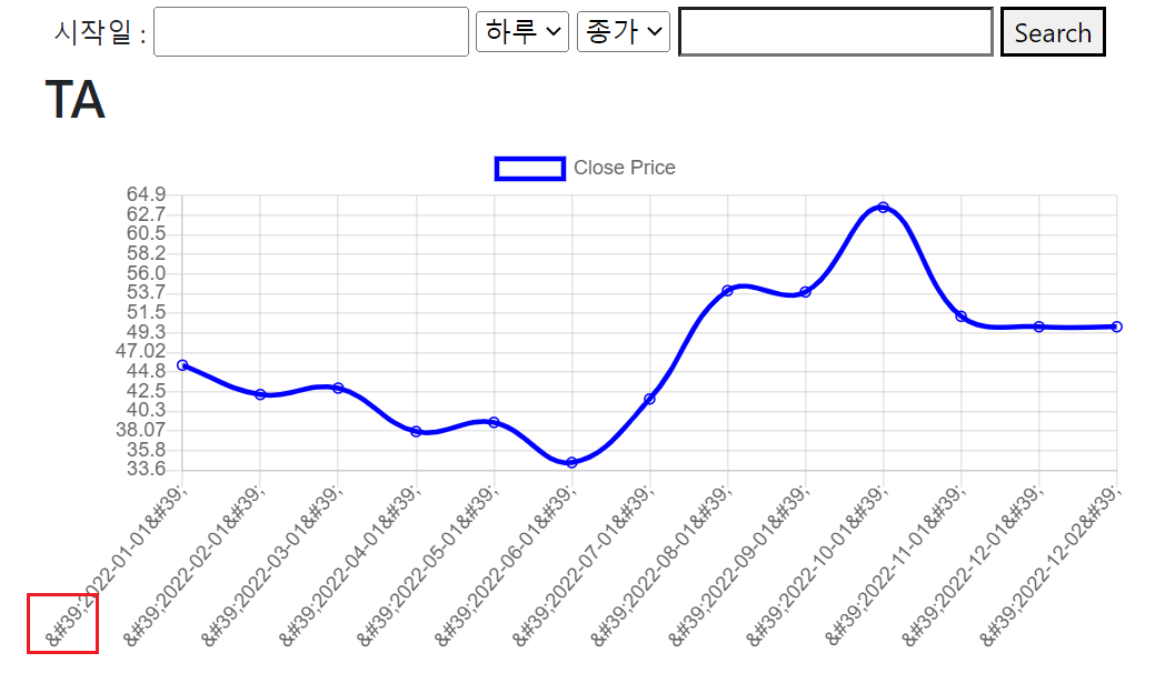먼저 내가 겪은 문제 상황은 Flask 백엔드에서 ['A', 'B', 'C']와 같은 문자열 리스트 형태의 데이터를 render_template로 프론트에게 전달하면서 발생했다. 프론트에서 전달받은 데이터는 리스트가 아닌 문자열로 인식되었고 중간의 ' 기호를 코드로 나타내면서 아래처럼 ' 로 변환되어 표시되었다.